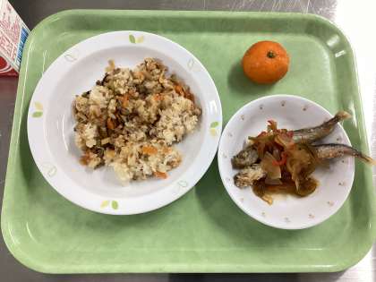 今日の給食は、中華おこわ、ししゃもの南蛮漬け、冷凍みかん、牛乳です。