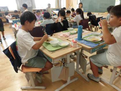 「いただきます」のあいさつとともに、夢中になって食べている様子