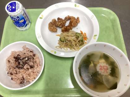 今日の給食は、赤飯、鶏肉のからあげ、もやしのごま酢あえ、開校記念日祝い汁、ジョアです。池之上小学校84回目の誕生日、前日お祝いメニューになっています。