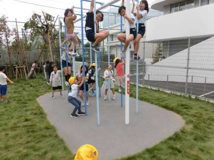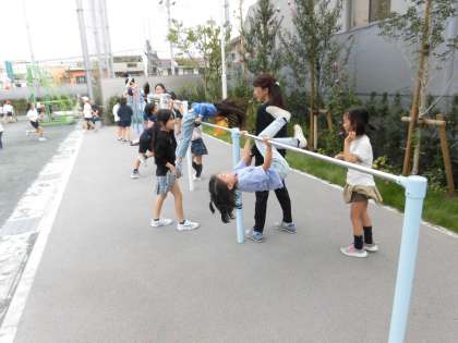 校庭には、上り棒や雲梯、鉄棒などの遊具があります。