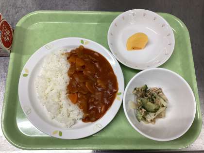今日の給食は、ハッシュドポークライス、青しそドレッシングサラダ、柿、牛乳です。