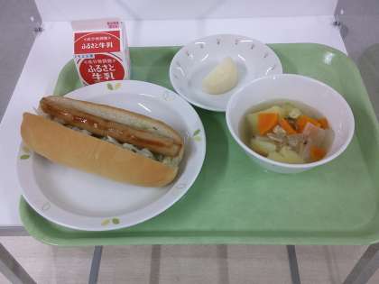 今日の給食は、ホットドック、ポトフ、梨、牛乳です。