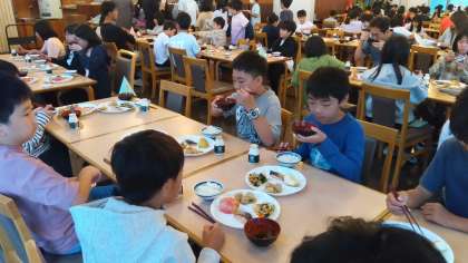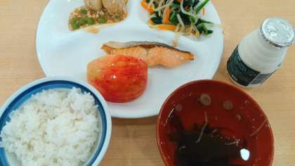 ご飯に、焼き鮭、里芋のそぼろ餡かけ、