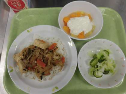すき焼き丼、やさいの一塩、フルーツヨーグルト、牛乳です。