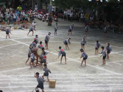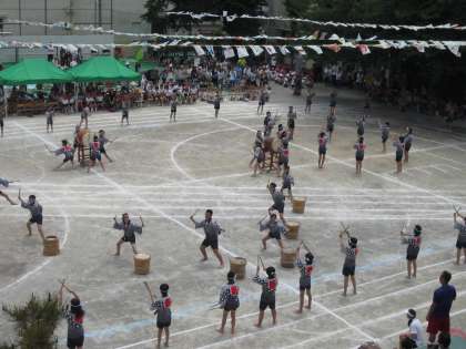 「八木節」は、高学年になった5年生の見せ場のひとつです。6年生は和太鼓とたるのたたき方を昨年度の6年生から教えてもらい練習を積んできました。みんな、いなせなはっぴ姿がきまっています。