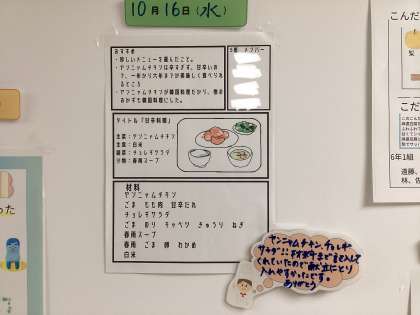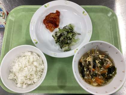 今日の給食は、ご飯、ヤンニョムチキン、チョレギサラダ、卵入り春雨スープ、牛乳です。今日は、6年2組5班が考えてくれた献立です。ヤンニョムチキン、チョレギサラダ、初メニューです。ヤンニョムチキンは食べやすいようにケチャップベースの味付けにしました。