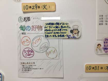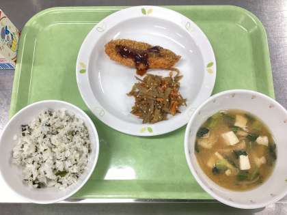 今日の給食は、わかめごはん、鮭フライ、きんぴらごぼう、豆腐と油揚げの味噌汁、牛乳です。今日は6年2組6班が考えた献立です。