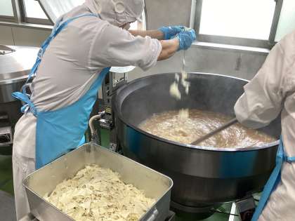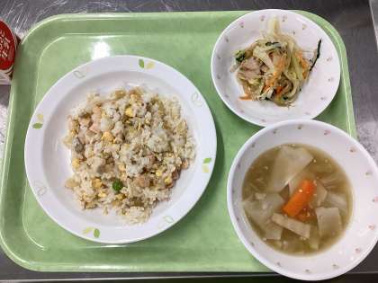 今日の給食は、鮭チャーハン、ワンタンスープ、焼肉サラダ、牛乳です。