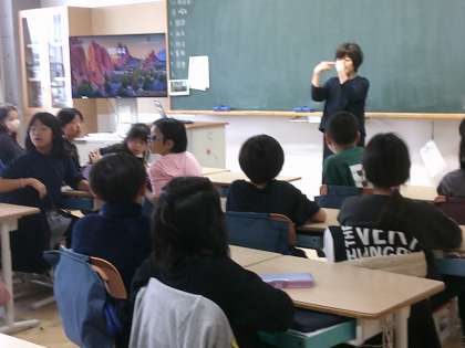 「雲」や曜日の手話など、成り立ちなども交えて教えていただき、子供たちは興味深くお話を聞いていました。