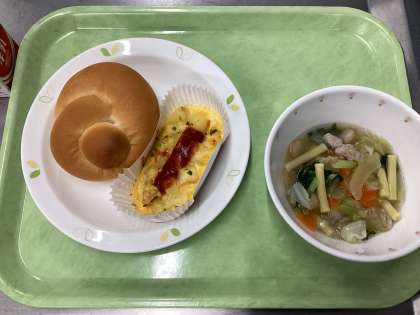 今日の給食は、チーズパン、スペイン風オムレツ、小さなスプーンおばさんのマカロニスープ、牛乳です。今日も図書館コラボ給食です。