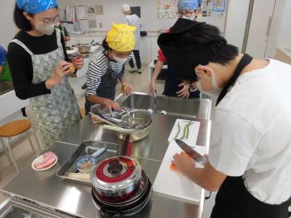 女子に指示されながら、男子が人参やインゲンを切ったり、