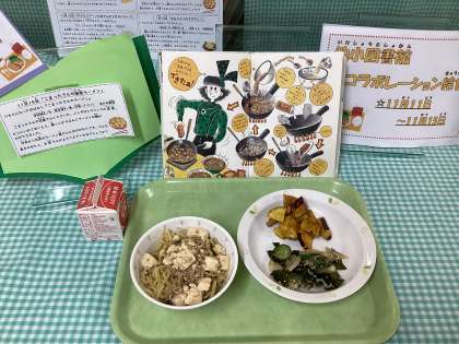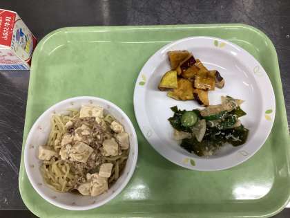 11月14日(木)の給食は、こまったさんの麻婆ラーメン、じゃことわかめのサラダ、大学いも、牛乳です。サラダにキャベツを入れる予定でしたが、キャベツ高騰のため、大根を増量しております。図書館コラボ4日目です。初メニューでしたが、とてもよく食べてくれていました。