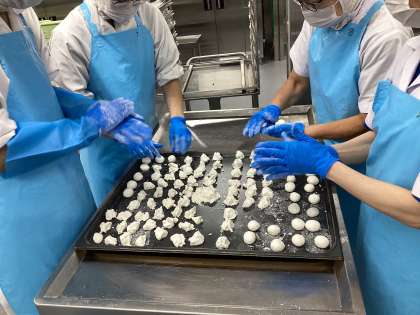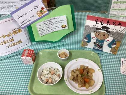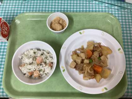 今日の給食は、青菜と鮭のご飯、肉じゃが、ももたろうのきびだんご、牛乳です。今日は最後の図書コラボ給食でした。プチプチとしたきびの食感を楽しんでもらうため、蒸したきびを白玉粉に混ぜて1300個ほど丸めました。