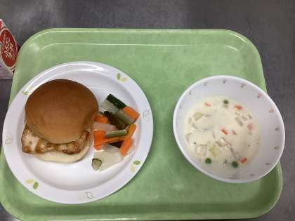 今日の給食は、ママレードチキンバーガー、クラムチャウダー、ピクルス、牛乳です。今日は給食室の機材のトラブルがあり、食器や食具の変更をして提供しています。