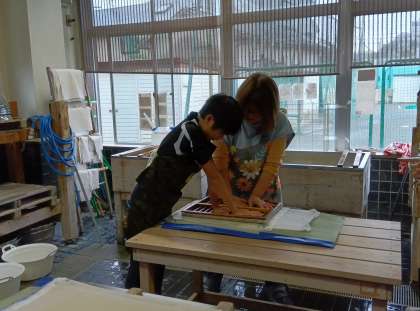 6年2組の紙漉き体験教室は、順調に進んでいます。