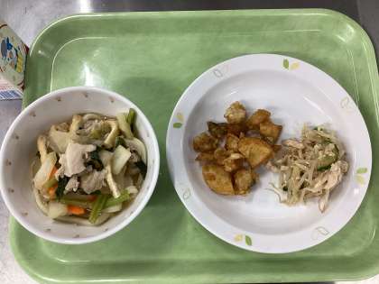 今日の給食は、味噌うどん、ホキとじゃがいもの揚げ煮、バンバンジー、牛乳です。キャベツ高騰のため、もやしに食材変更しています。