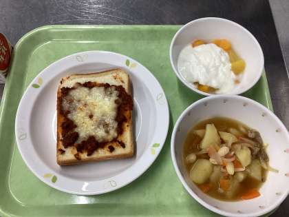 今日の給食は、ミートースト、白いんげんの田舎風スープ、フルーツヨーグルト、牛乳です。