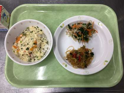 今日の給食は、クッパ、チャプチェ、三色ナムル、牛乳です。