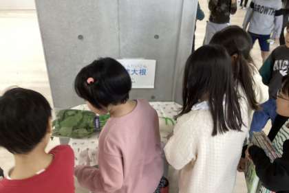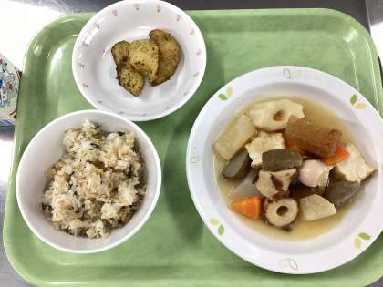 今日の給食は、コマツナごはん、大蔵大根のおでん、青のりフライドポテト、牛乳です。今日は世田谷区で収穫された大蔵大根を31kg使いました。