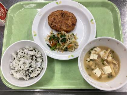 今日の給食は、わかめごはん、手作りさつま揚げ、小松菜のおひたし、豆腐と油揚げのみそ汁、牛乳です。