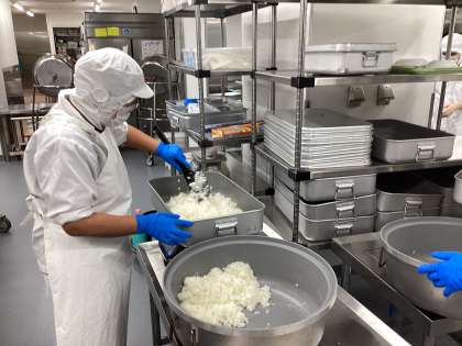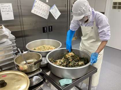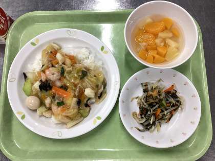 今日の給食は、中華丼、もやしの海苔酢あえ、フルーツポンチ、牛乳です。