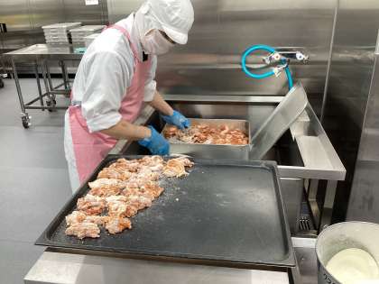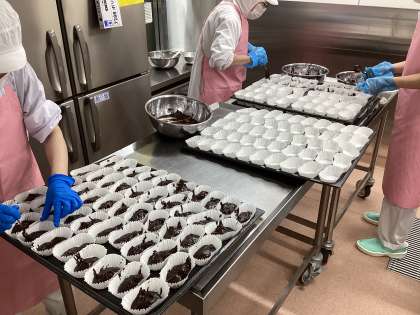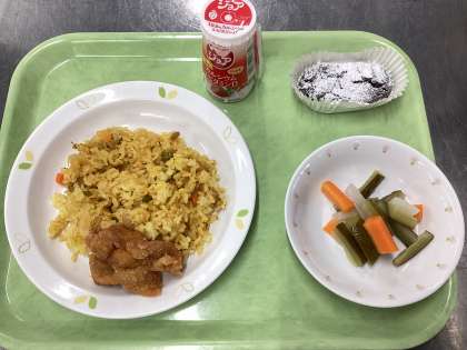 今日の給食は、ツナカレーピラフ、フライドチキン、ピクルス、ブラウニー、ジョア(ストロベリー)です。今日は2学期最後の給食、クリスマスメニューでした。1学期より、どのクラスもよく食べるようになりました。2学期もありがとうございました。