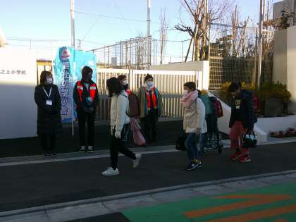 学期の始めに、地域の方、保護者の方に参加していただき、登校してくる子どもたちとあいさつで交流するという活動です。