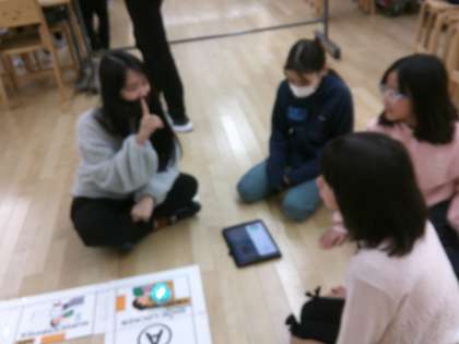 「プログラミング」のブースは、「go straight」「turn left」「turn right」などの表現を使いながら、指定された場所までたどり着くよう実際にプログラミングを行うブースです。