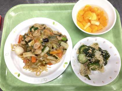 今日の給食は、五目あんかけ焼きそば、じゃことわかめのサラダ、フルーツポンチ、牛乳です。