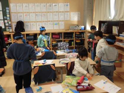 1年生の図工「つくって へんしん」の学習です。