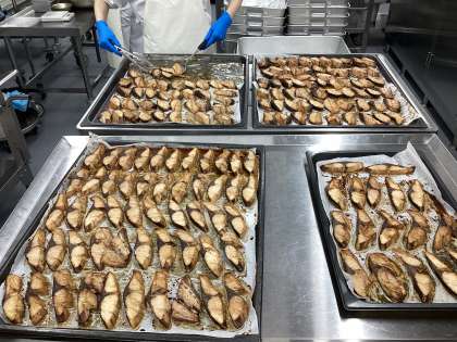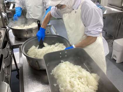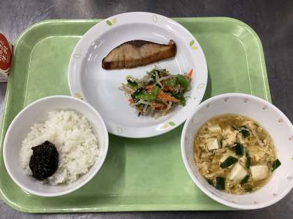 今日の給食は、有機米ごはん、海苔の佃煮、ぶりの照り焼き、塩ナムル、にらたまみそ汁、牛乳です。