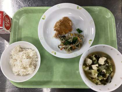 今日の給食は、麦ごはん、鶏肉のおろしあんかけ、野菜の乾物あえ、豆腐とわかめの味噌汁、牛乳です。