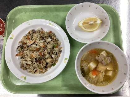 今日の給食は、五色ごはん、肉団子入りみそ汁、くだもの(はるか)、牛乳です。