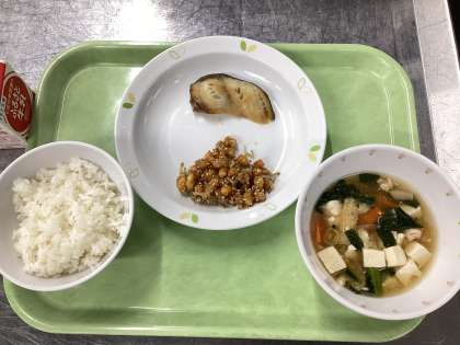 今日の給食は、有機米ごはん、銀鱈の西京焼き、大豆とじゃこの甘辛揚げ、吉野汁、牛乳です。