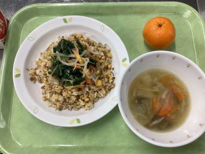 今日の給食は、ビビンバ、トック入りスープ、くだもの(ポンカン)、牛乳です。