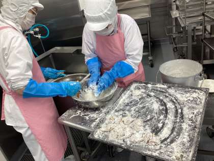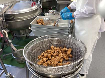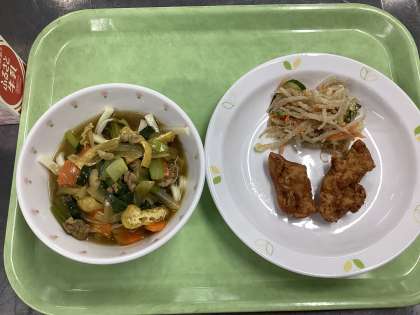 今日の給食は、カレーうどん、鶏肉の唐揚げ、もやしの胡麻酢あえ、牛乳です。唐揚げは、3年生のリクエスト給食です。