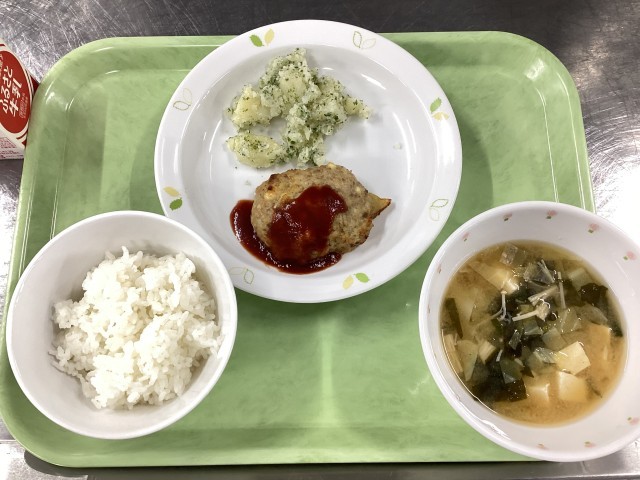 今日の給食は、ごはん、アップルチーズハンバーグ、粉ふき芋、豆腐とわかめの味噌汁、牛乳です。スライスしたりんごを玉ねぎと一緒に炒め、ハンバーグに入れました。