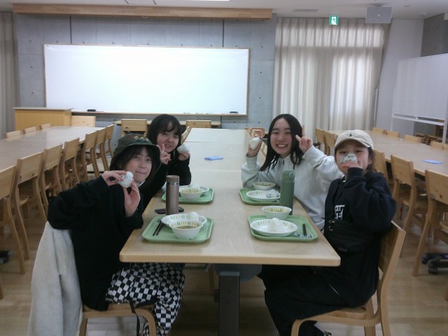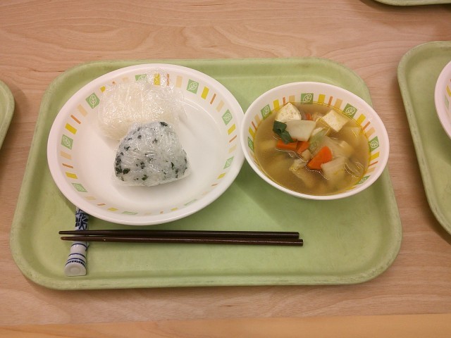 今日のメニューは、塩むすびとけんちん汁です。