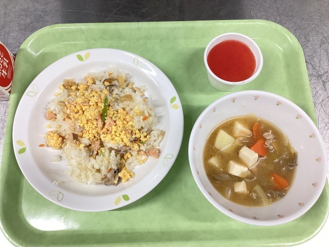 今日の給食は、鮭ちらし、豚汁、パンナコッタイチゴソース、牛乳です。ひな祭りメニューです。
