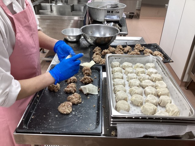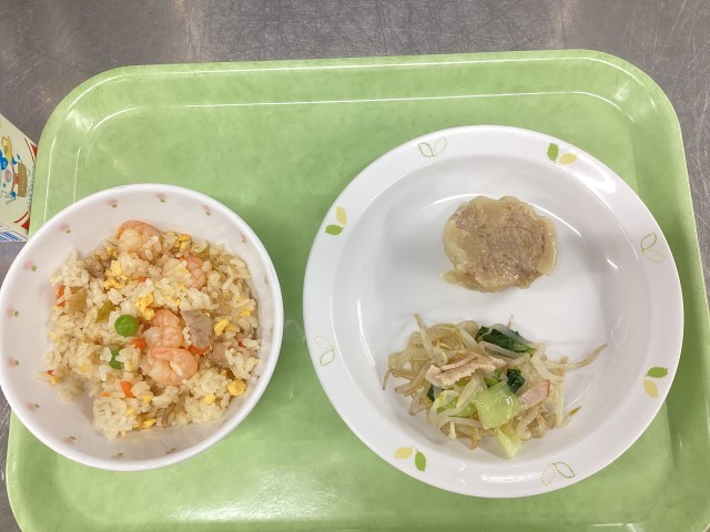 今日の給食は、チャーハン、ジャンボしゅうまい、青梗菜の中華和え、牛乳です。1年生は3日目の給食です。よく食べてくれています。