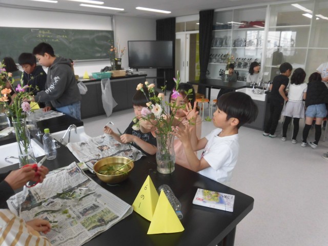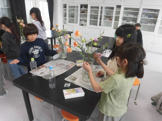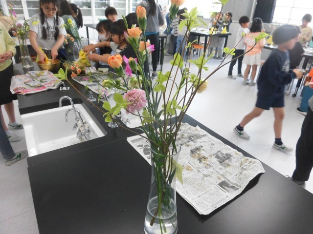 昼休みには、子ども達が理科室に集まり花瓶に花を飾っていきました。