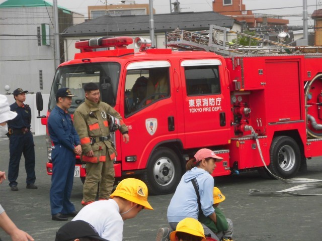 消防車の周りに座って描き始めました。