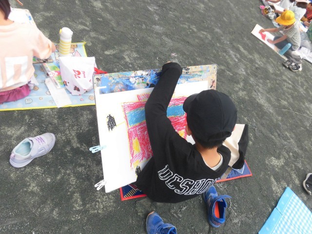 図工の先生のアドバイスを受けて、画用紙に大きく消防車を描いていました。