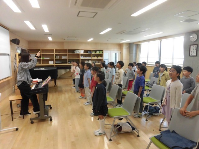 音楽室では、3年生が離任式で歌う歌の練習をしていました。