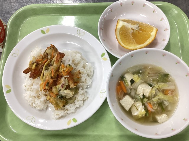 今日の給食は、かき揚げ丼、豆腐汁、甘夏、牛乳です。