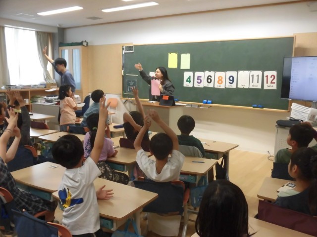 2年生は、外国語活動を楽しんでいました。見えている数字をもとに隠れている数字を予想し、
