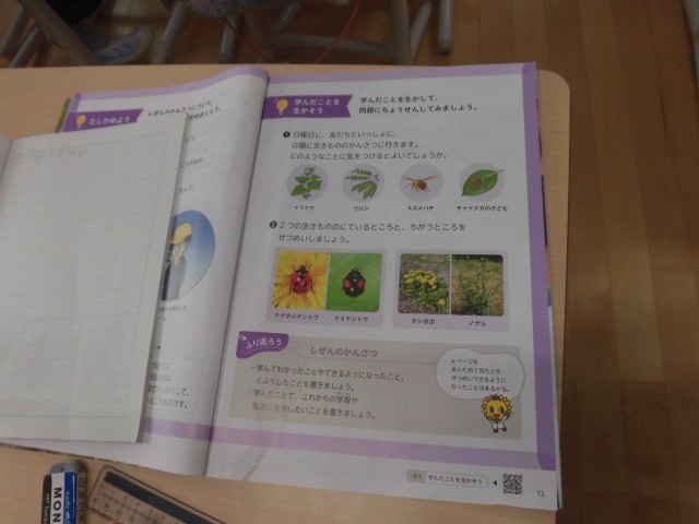 教科書の写真にある2種類のてんとう虫を見て、ちがうところを探していました。