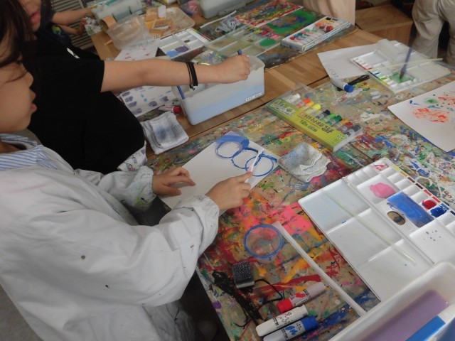 筆の代わりに歯ブラシやスポンジ、ストローなどを使って絵を描いていました。