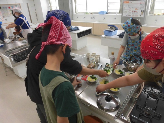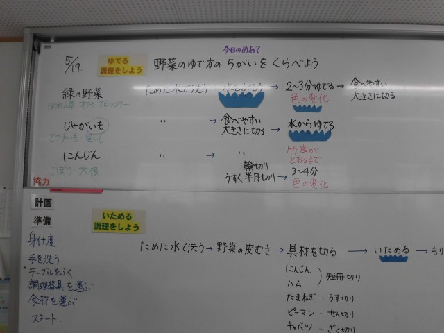 今回は、野菜を茹でたり、炒めたりする実習です。