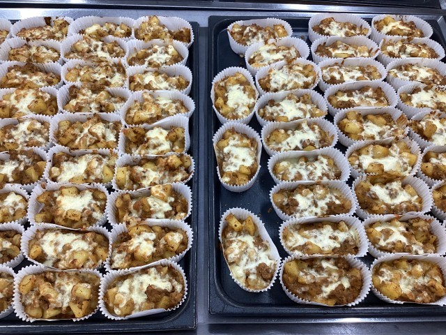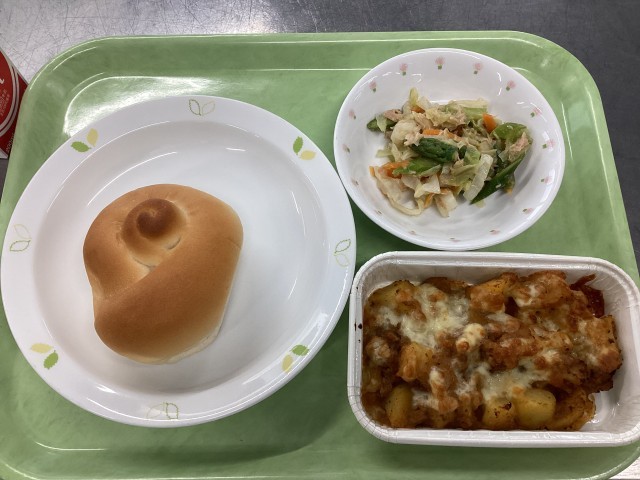 今日の給食は、ミルクパン、ポテトグラタン、アスパラと春キャベツのツナサラダ、牛乳です。